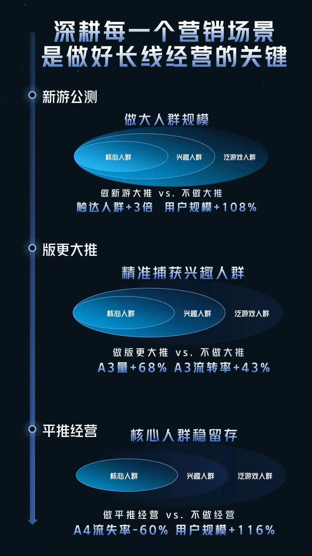 长线增长的关键在于“在正确的阶段,对正确的人传递正确的内容”,巨量引擎针对新游公测、版更大推两大核心节点,提供精准运营策略,实现全生命周期用户价值最大化。