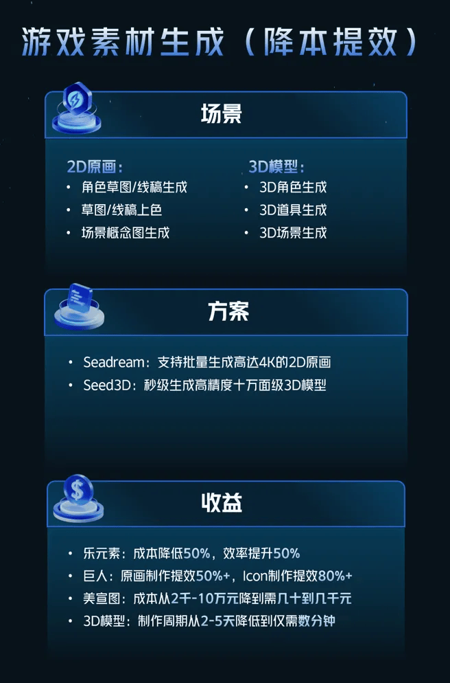 依托火山引擎,平台AI能力已深度融入从创意生成到投放优化的全链路。在素材生产端,AI能将试玩广告这类复杂素材的开发周期,从传统的数周缩短至1.5天,单个成本降至千元级别,实现了供给量的快速翻倍。
