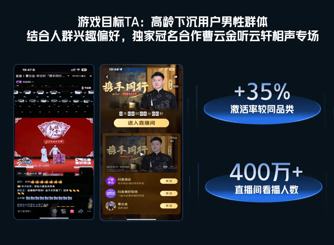 在版本大推期,目标重点则转向精准唤醒与破圈,关键在于绑定精准兴趣圈层与社会热点。例如,某游戏独家冠名曹云金相声专场,成功触达高龄下沉男性用户,直播间看播人数达400万+,激活率较同品类提升35%;另一游戏推出校园Live计划,斩获28个全网热搜,成功打入年轻泛游戏人群。