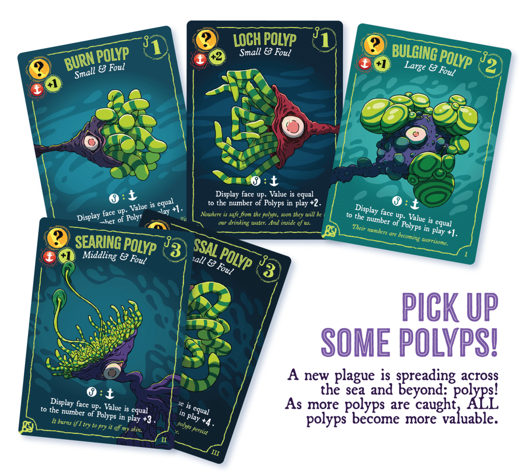 在本款游戏中,1-5名玩家将本方的回合中以此驾驶渔船前往密布诡异鱼群的海域进行捕捞作业:
