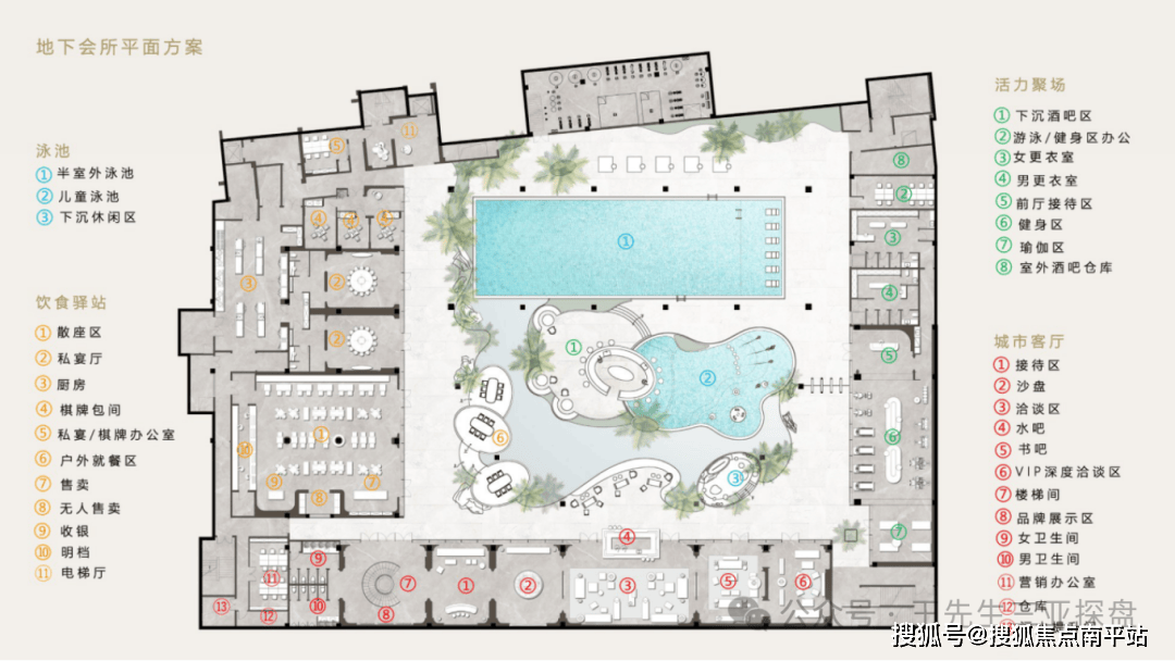 约3000㎡下沉式会所涵盖成人泳池、儿童泳池、健身房、私宴餐厅、下沉酒吧等多样邻里复合功能,满足业主社交、健身等多种需求。