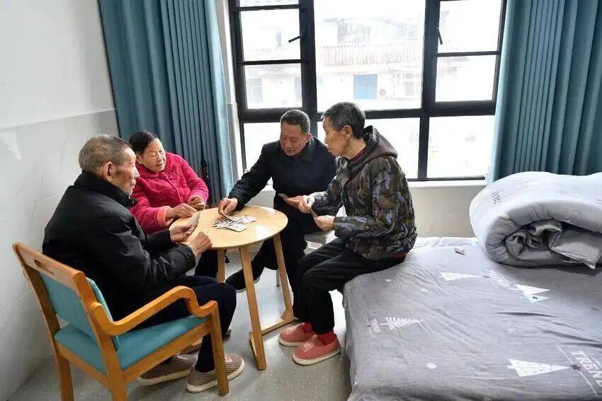闲暇时光,老人们或在房间、走道里棋牌娱乐,或聚在阳台上晒太阳、唠家常,欢声笑语此起彼伏。