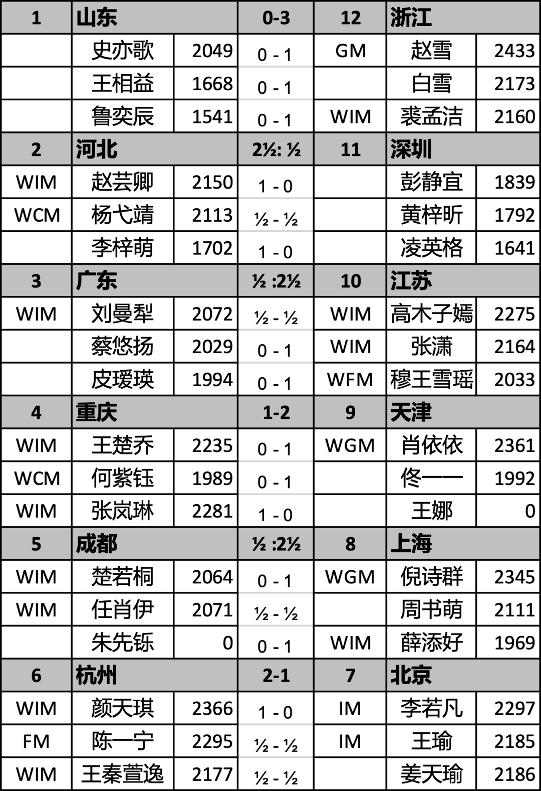女子组的所有比赛全部分出胜负:浙江队气势如虹,3-0零封山东队;年轻的河北队战胜了更年轻的深圳队;杭州队颜天琪拿到关键胜利,帮助本队战胜北京队。其他比赛中,江苏、天津、上海取得胜利。